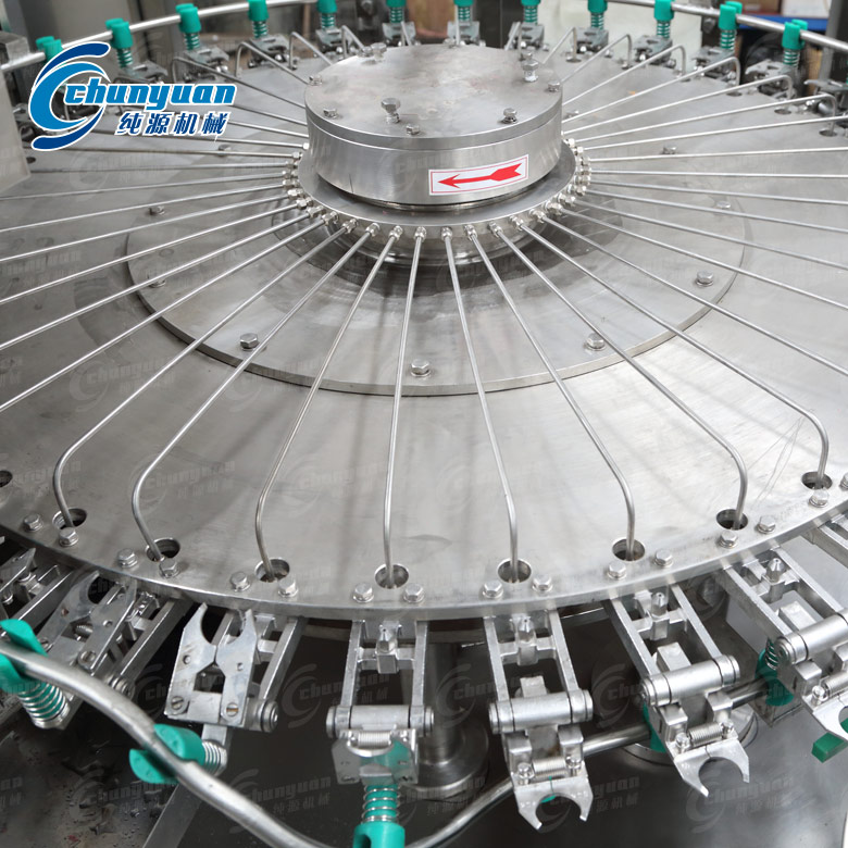 瓶子由通过风送道传递,然后通过拨瓶星轮传送至三合一机的冲瓶机。冲瓶机回转盘上装有瓶夹,瓶夹夹住瓶口沿一导轨翻转180°,使瓶口向下。在冲瓶机特定区域,冲瓶夹喷嘴喷出冲瓶水,对瓶子内壁进行冲洗。瓶子经冲洗、沥干后在瓶夹夹持下沿导轨再翻转180°,使瓶口向上。洗净后的瓶子通过拨瓶星轮由冲瓶机导出并传送至