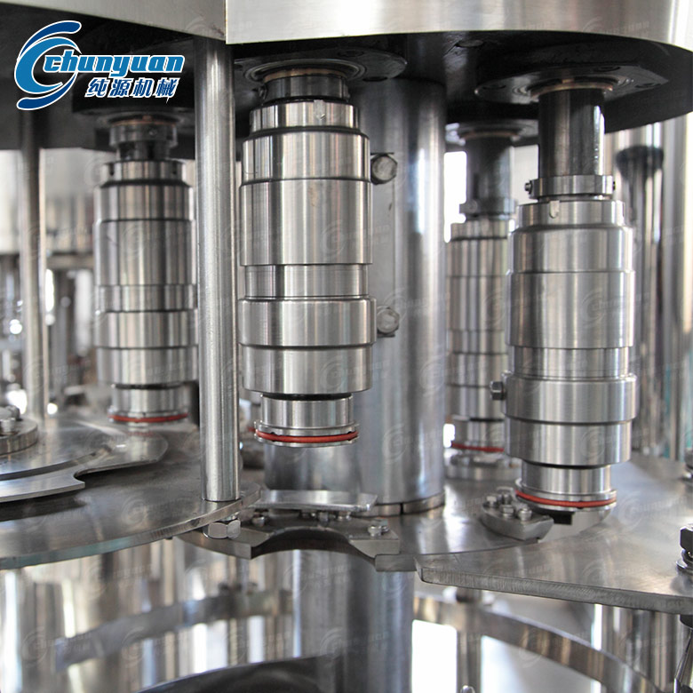 纯净水精品麻豆视频网设备的瓶子由瓶颈托板卡住并在凸轮作用下将瓶子上升,然后由瓶口将精品麻豆视频网阀顶开。精品麻豆视频网采用重力精品麻豆视频网方式。精品麻豆视频网阀打开后物料通过精品麻豆视频网阀完成精品麻豆视频网过程,精品麻豆视频网结束后瓶口下降离开精品麻豆视频网阀,瓶子通过卡瓶颈过渡拨轮进入旋盖机。旋盖机上的止旋刀卡住瓶颈部位,保持瓶子直立并防止旋转。旋盖头在旋盖机上保持公转并自转,在凸轮作用下实现抓盖、套盖、旋盖、脱盖动作,完成整个封盖过程。成品瓶通过出瓶拨轮从旋盖机传送到出瓶输送链上,由输送链传送出三合一水精品麻豆视频网机。