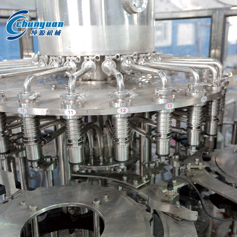 洗净后的瓶子通过拨瓶星轮由冲瓶机导出并传送至橙汁饮料精品麻豆视频网机。进入精品麻豆视频网设备的瓶子由瓶颈托板卡住并在凸轮作用下将瓶子上升,然后由瓶口将精品麻豆视频网阀顶开。精品麻豆视频网采用重力精品麻豆视频网方式。精品麻豆视频网阀打开后物料通过精品麻豆视频网阀完成精品麻豆视频网过程,精品麻豆视频网结束后瓶口下降离开精品麻豆视频网阀,瓶子通过卡瓶颈过渡拨轮进入旋盖机。