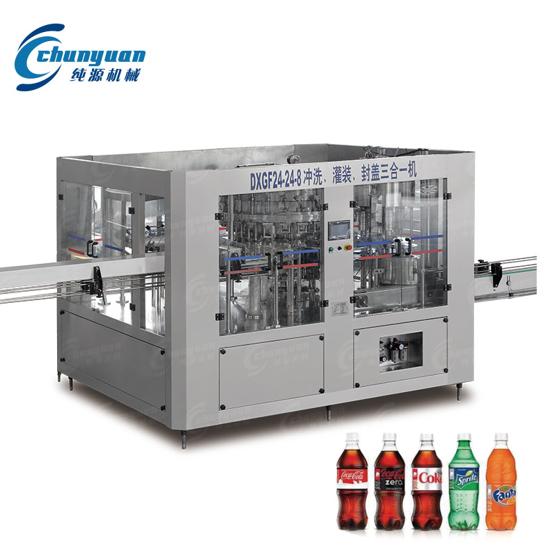 碳酸饮料精品麻豆视频网机将冲洗、精品麻豆视频网、封盖三功能组合在一个机体上,全过程实现自动化,全自动碳酸饮料设备适用于精品麻豆视频网可乐、雪碧、含气饮料等含二氧化碳气体的饮料。含气饮料精品麻豆视频网生产线配有CO2压力控制精确,液位控制稳定;设有多处卡瓶、缺瓶、缺盖、过载等保护报警装置,确保出品质量。